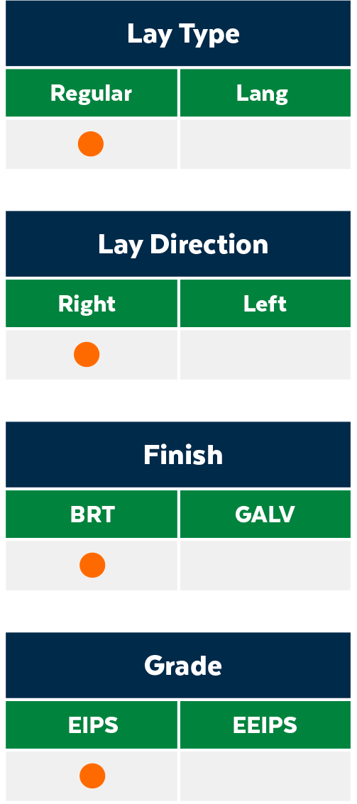 | Diameter (in) | Diameter (mm) | Weight (Ib/ft) | Minimum Breaking Force (tons for 2000 Ibs) EIPS 1960 | Minimum Breaking Force (tons for 2000 Ibs) EEIPS 2160 |